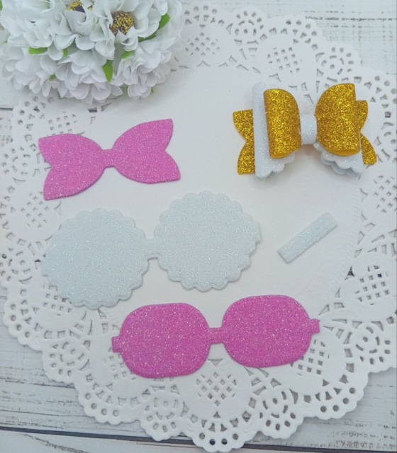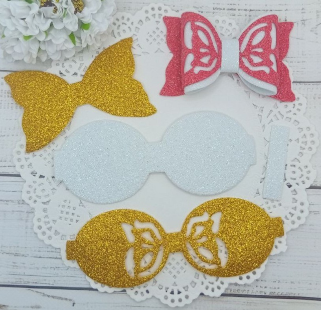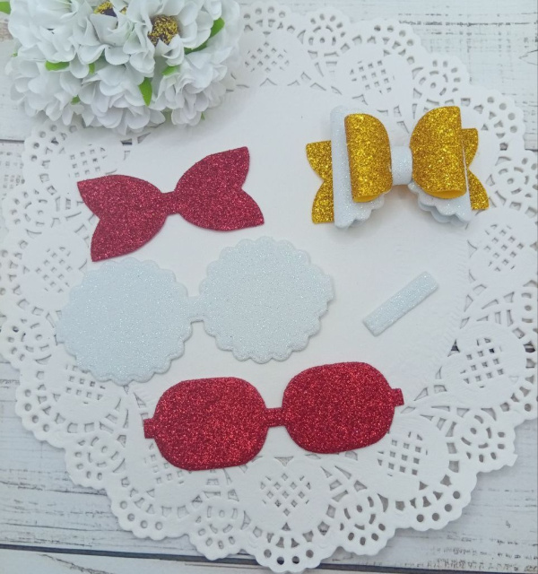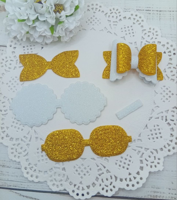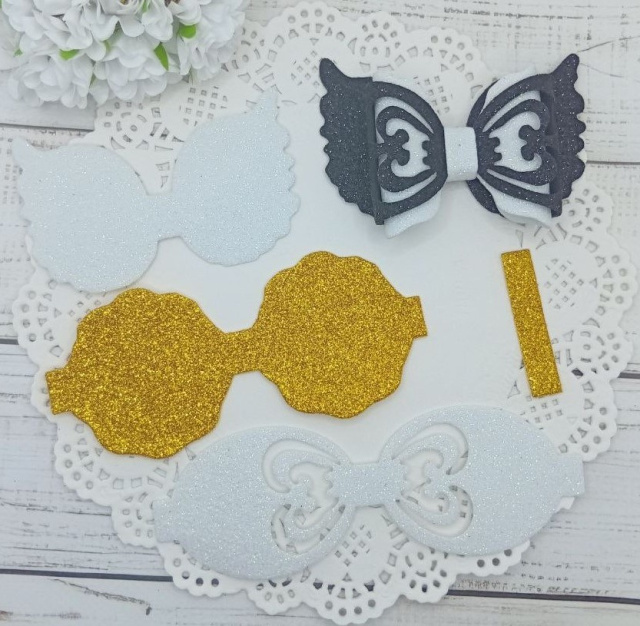 Вирубка бантик великий з бантиком золото-білий 9,7*6 см з фоамірану з глітером,набір деталей.