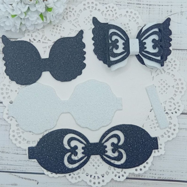 Вирубка бантик великий з крильцями чорно-білий 9,5*6,4 см з фоамірану з глітером,набір деталей.