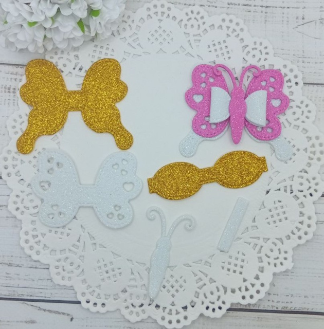 Вирубка бантик метелик золото-білий 7,5*6,5 см з фоамірану з глітером,набір деталей
