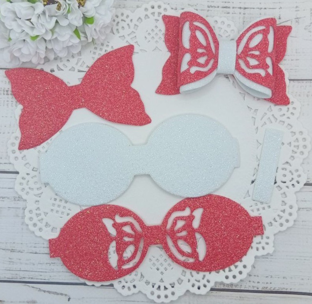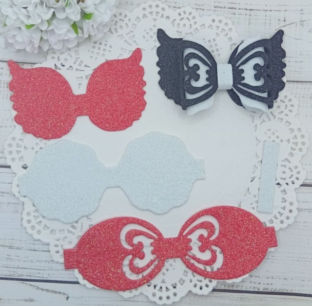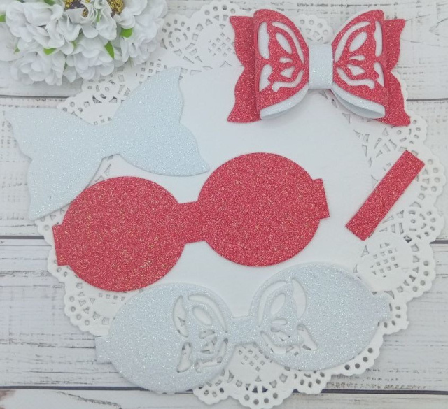 Вирубка бантик великий з бантиком коралово-білий 9,7*6 см з фоамірану з глітером,набір деталей.
