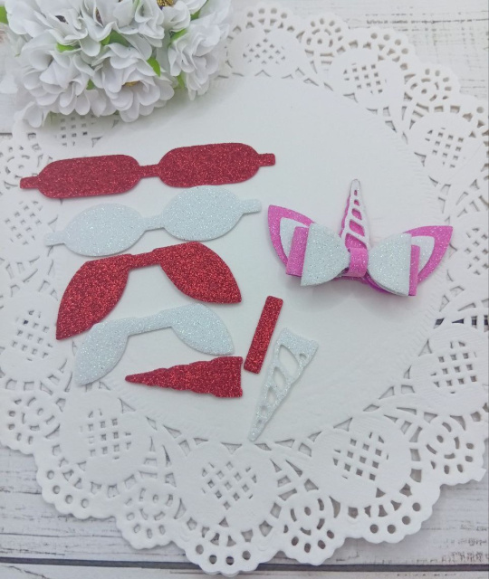 Вирубка бантик «Єдиноріг» червоно-білий 6,5*4,5 см з фоамірану з глітером,набір деталей.