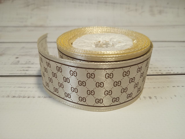 Стрічка атласна з малюнком Гуччі.Колір: молочний. Розмір: 2,5 см, Рівне